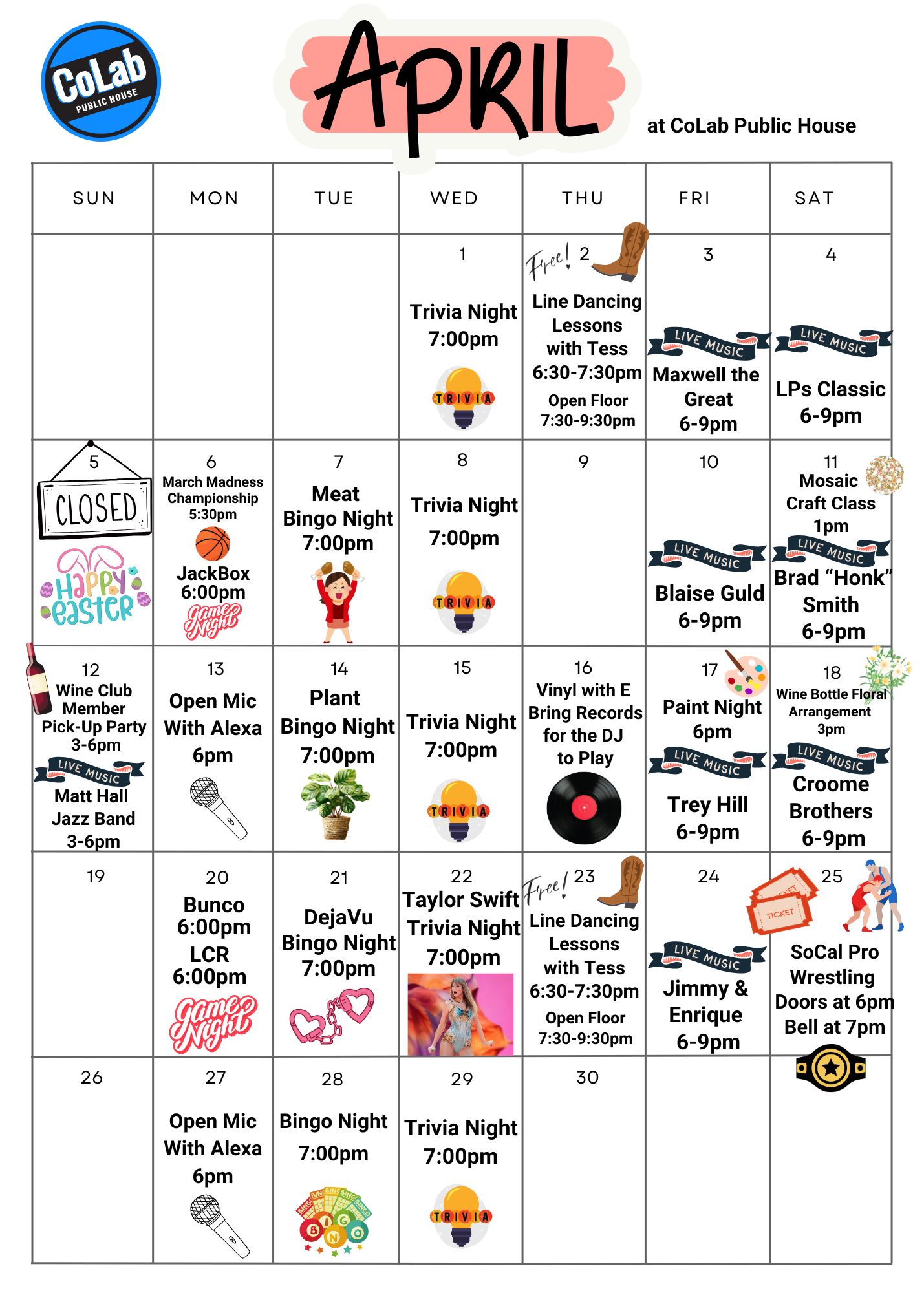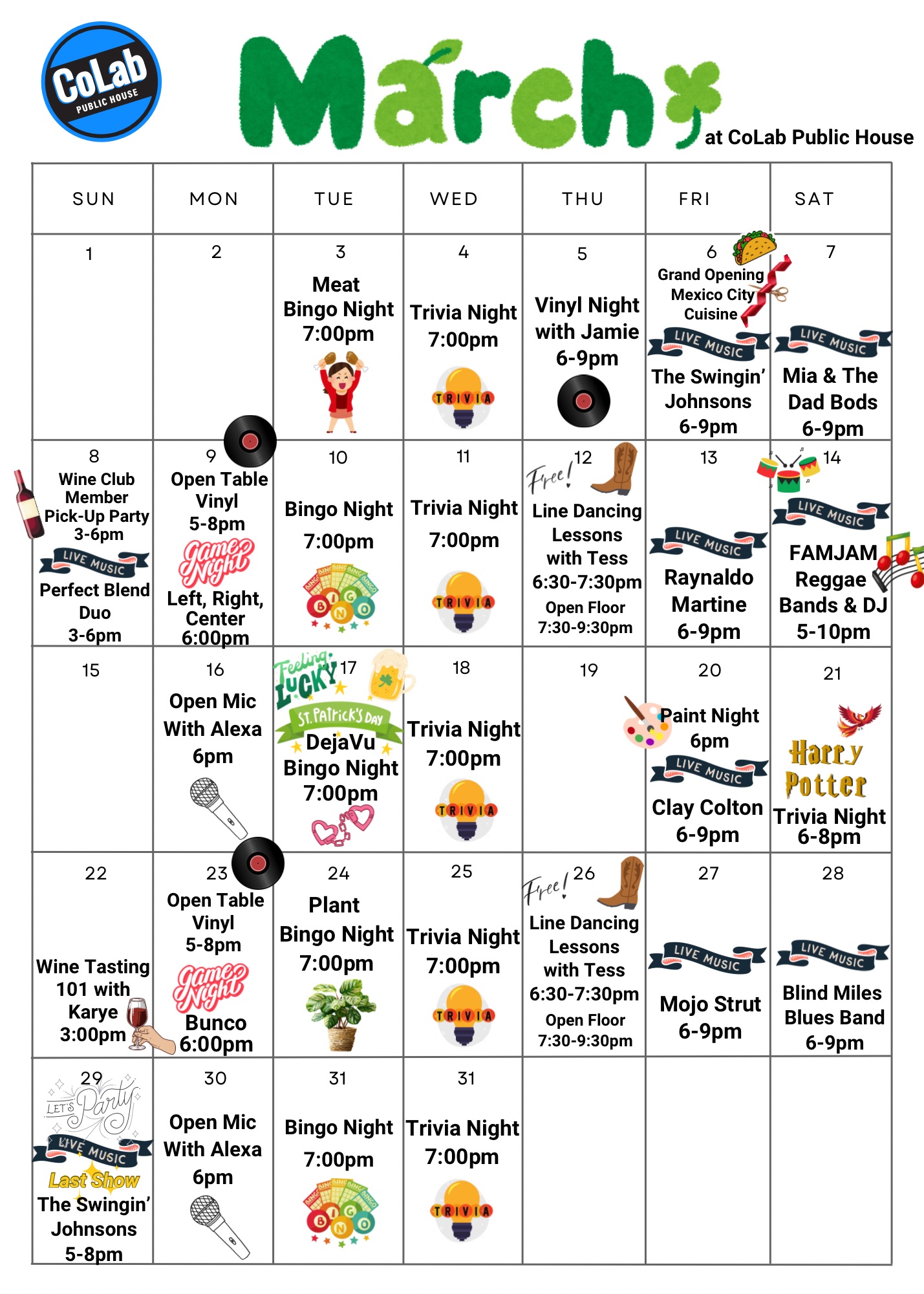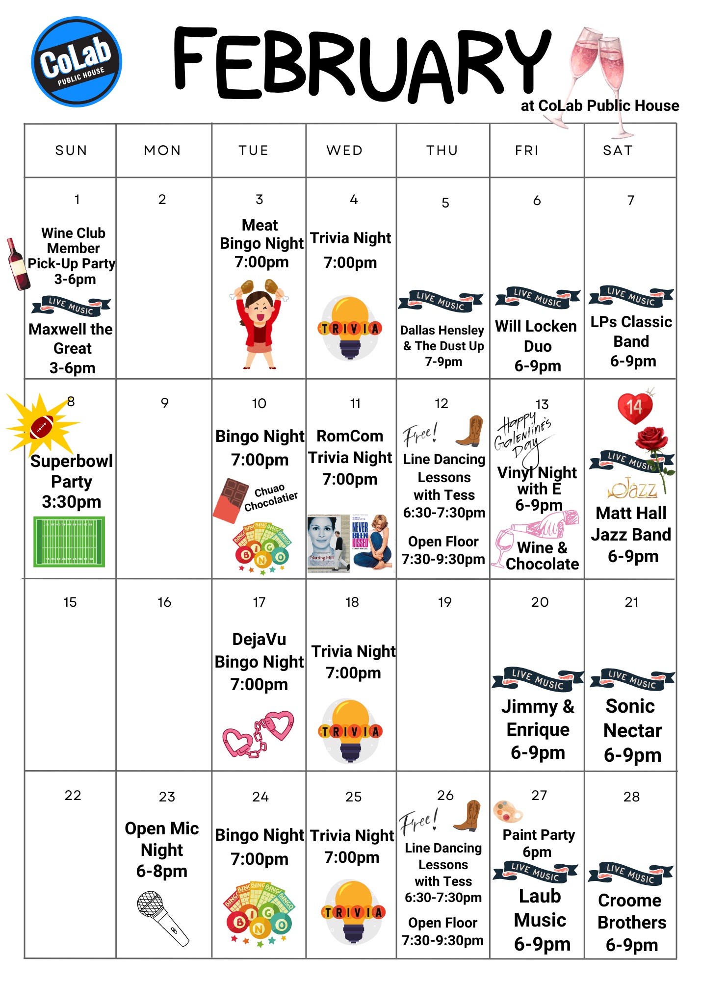 If there is one thing we love to do, it’s have fun. Every week CoLab Public House host all kinds of events. Gather up your friends and come have a great time with live music, trivia nights, or even our bingo events. Below are the events we have coming up. Make sure you follow us on our social media channels to see when new events are added.