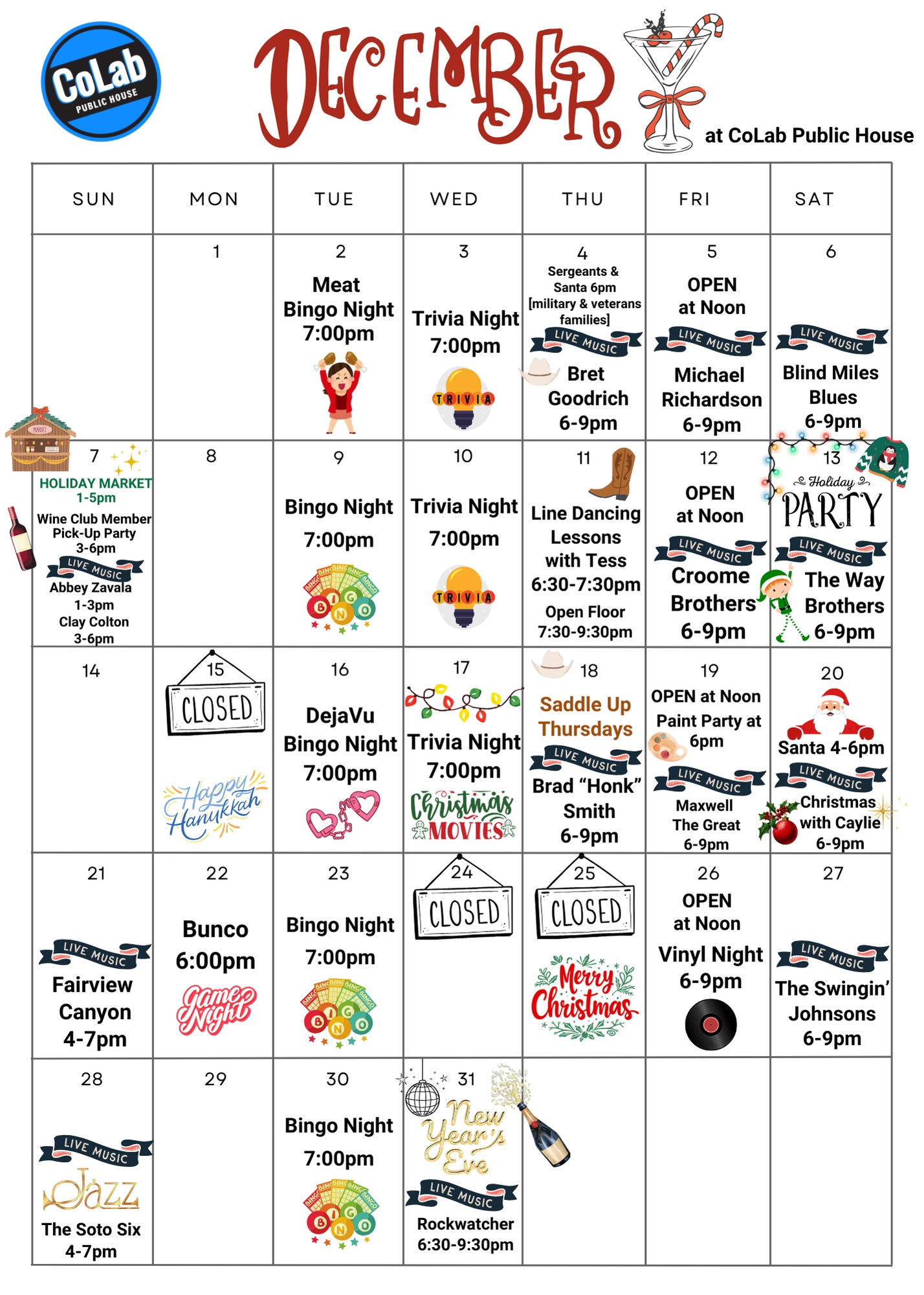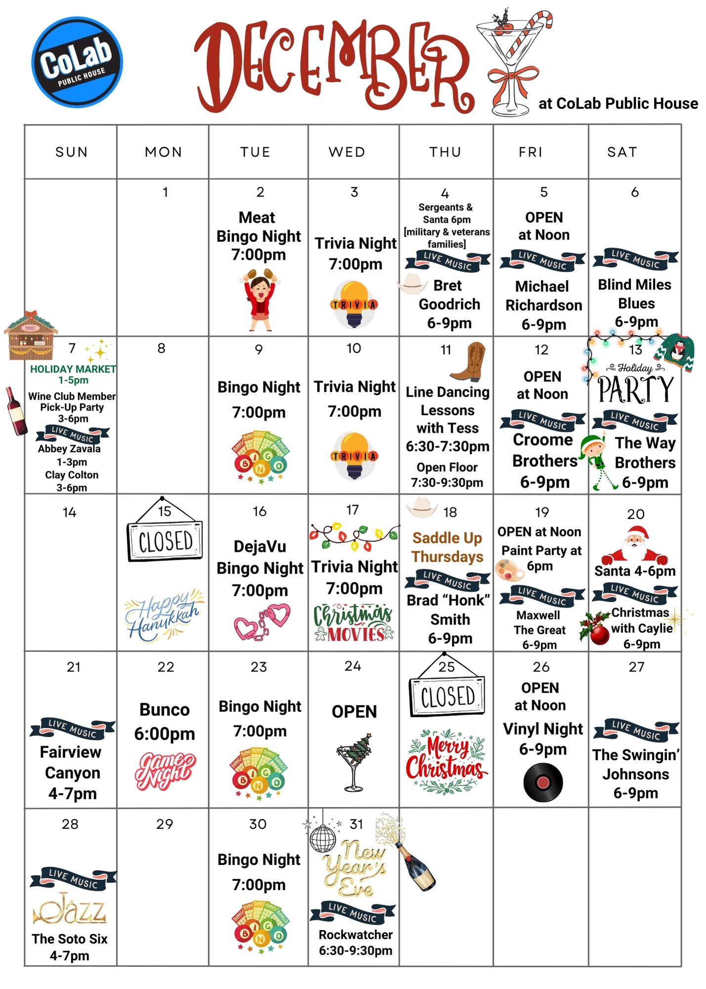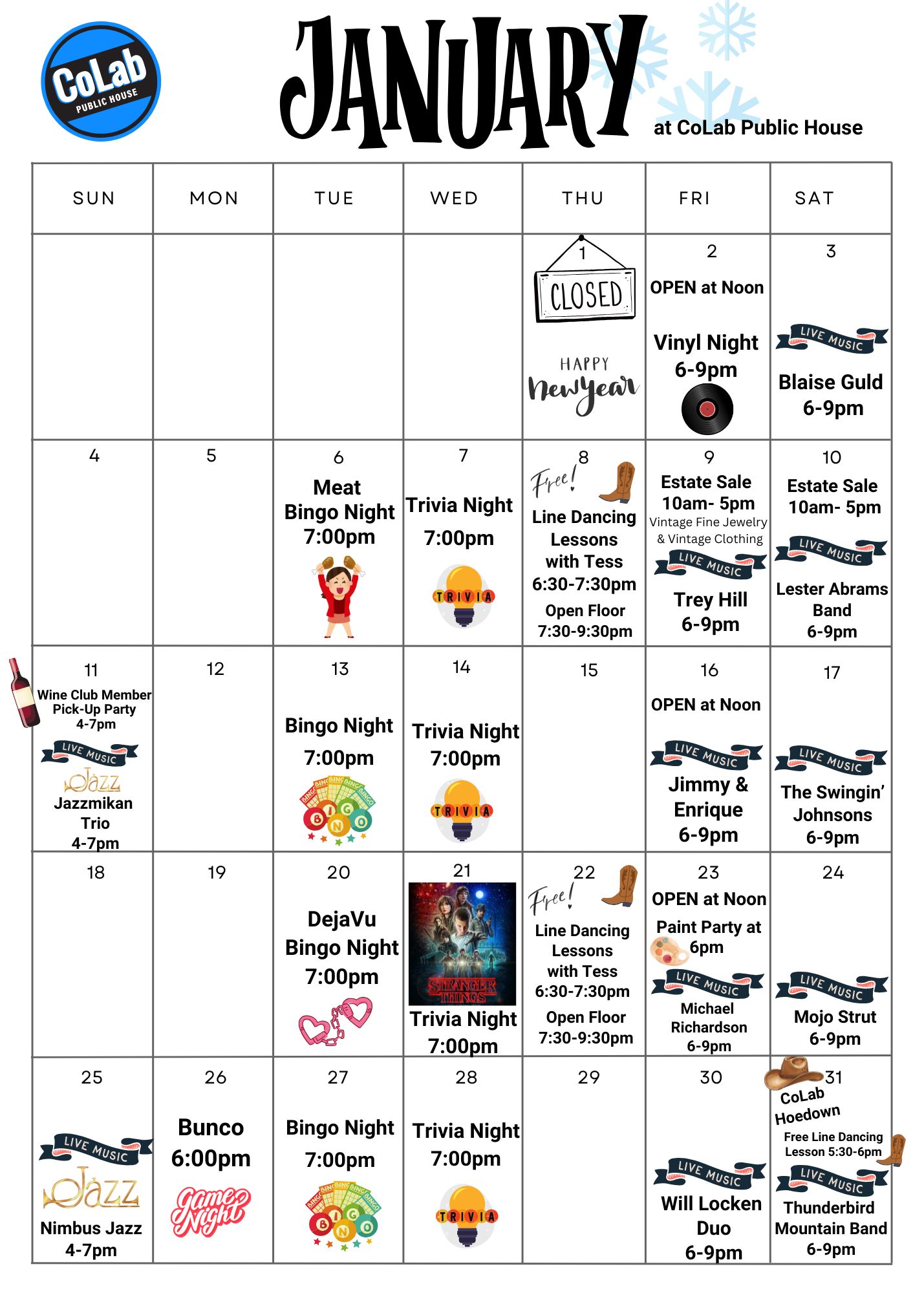 If there is one thing we love to do, it’s have fun. Every week CoLab Public House host all kinds of events. Gather up your friends and come have a great time with live music, trivia nights, or even our bingo events. Below are the events we have coming up. Make sure you follow us on our social media channels to see when new events are added.