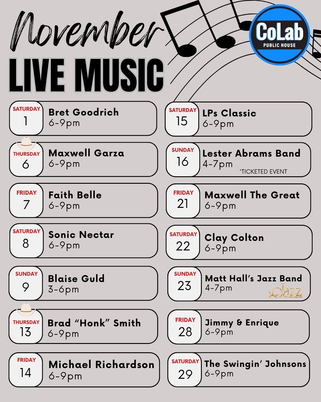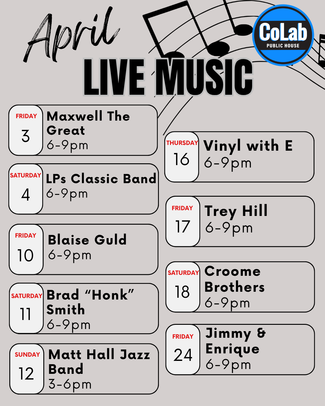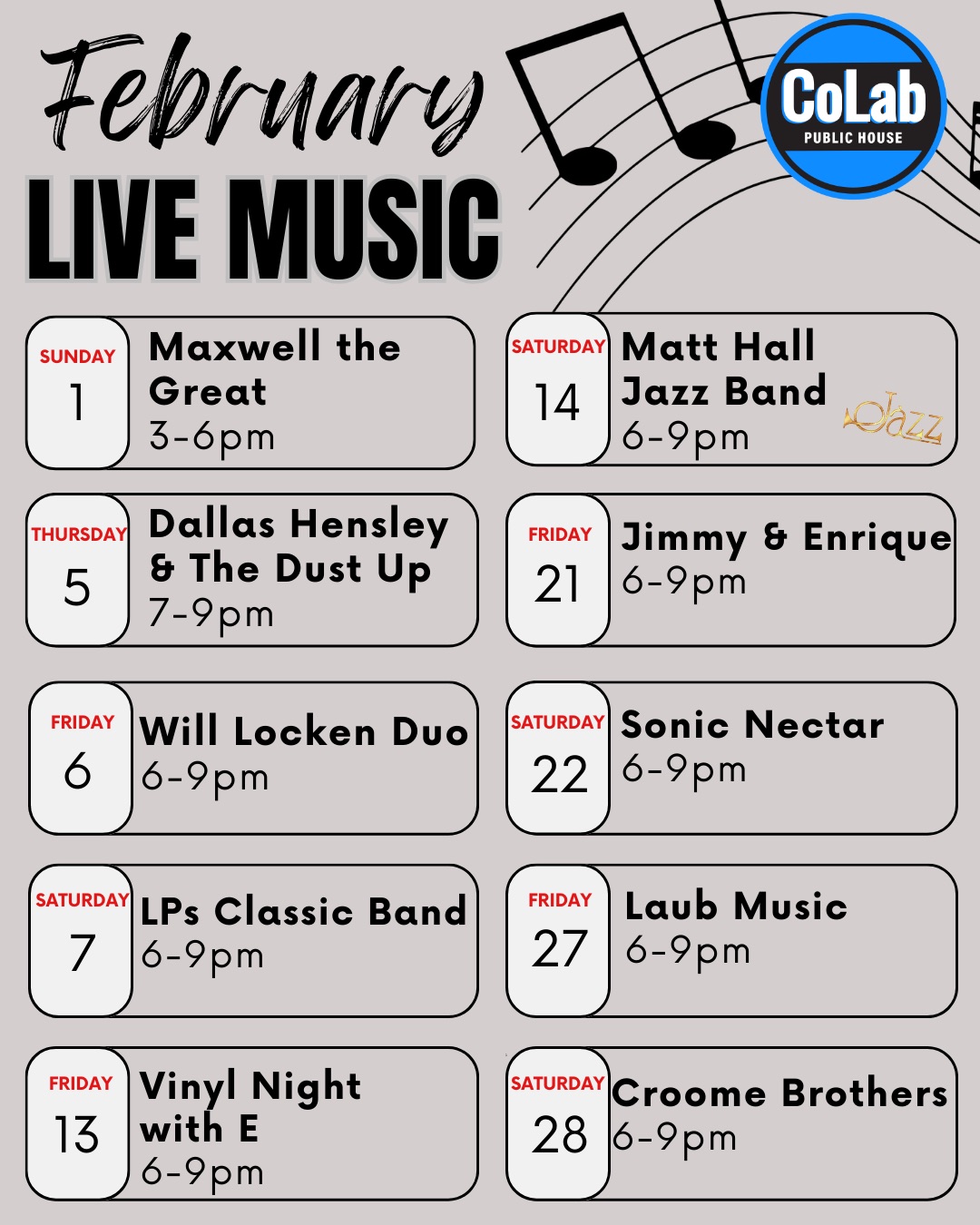 Music lovers, this one’s for you! At CoLab Public House, we don’t just enjoy live music—we live for it. Every month, we curate a lineup of fresh talent and crowd favorites to keep the energy high and the good times rolling. Whether you’re here for the rhythm, the craft beer, or just a good night out, we’ve got something for everyone.