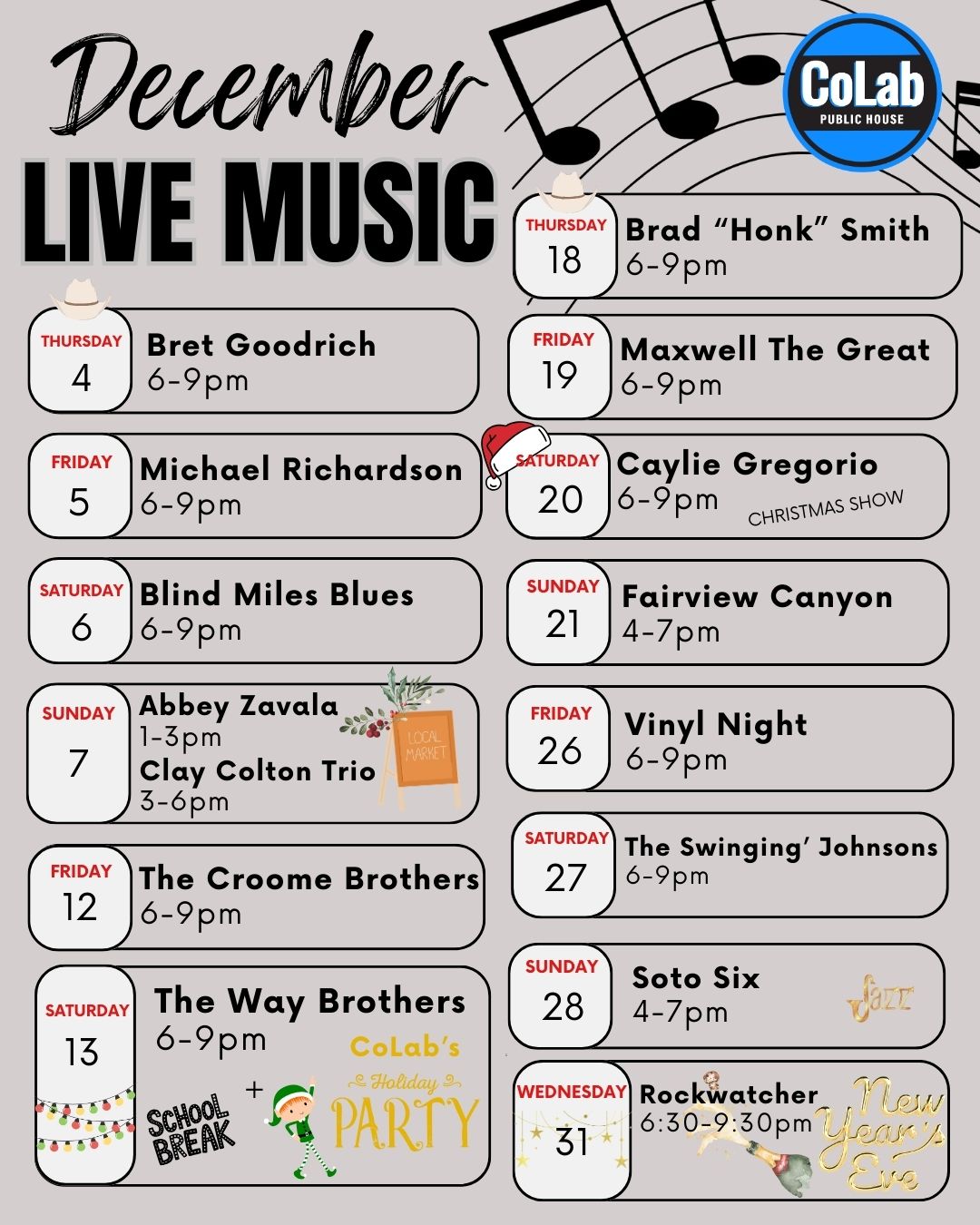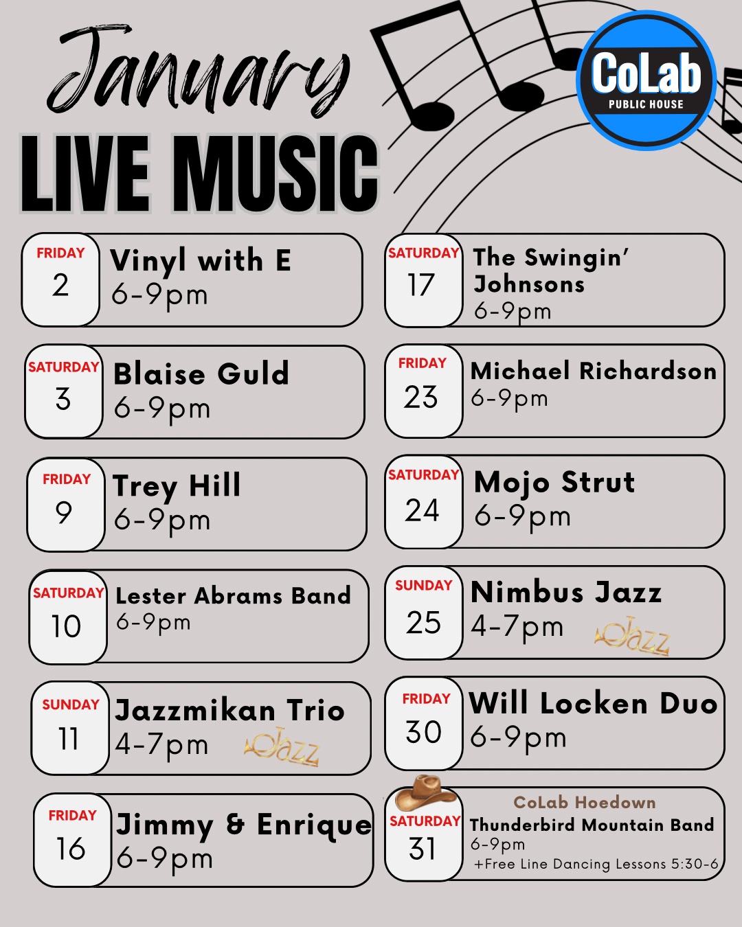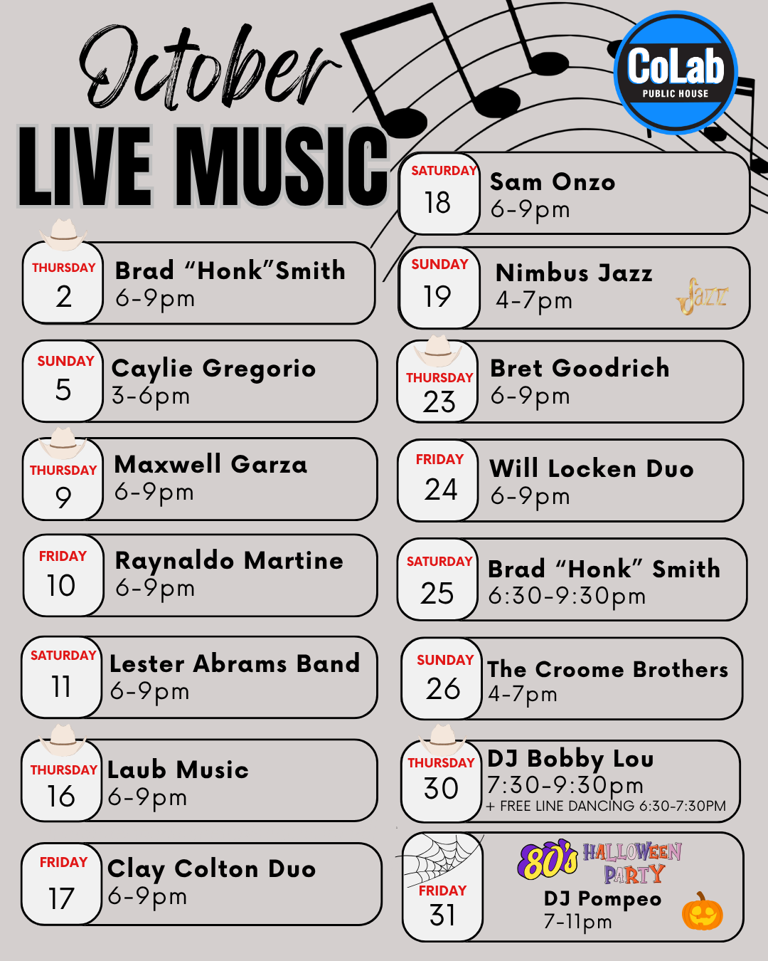 Music lovers, this one’s for you! At CoLab Public House, we don’t just enjoy live music—we live for it. Every month, we curate a lineup of fresh talent and crowd favorites to keep the energy high and the good times rolling. Whether you’re here for the rhythm, the craft beer, or just a good night out, we’ve got something for everyone.